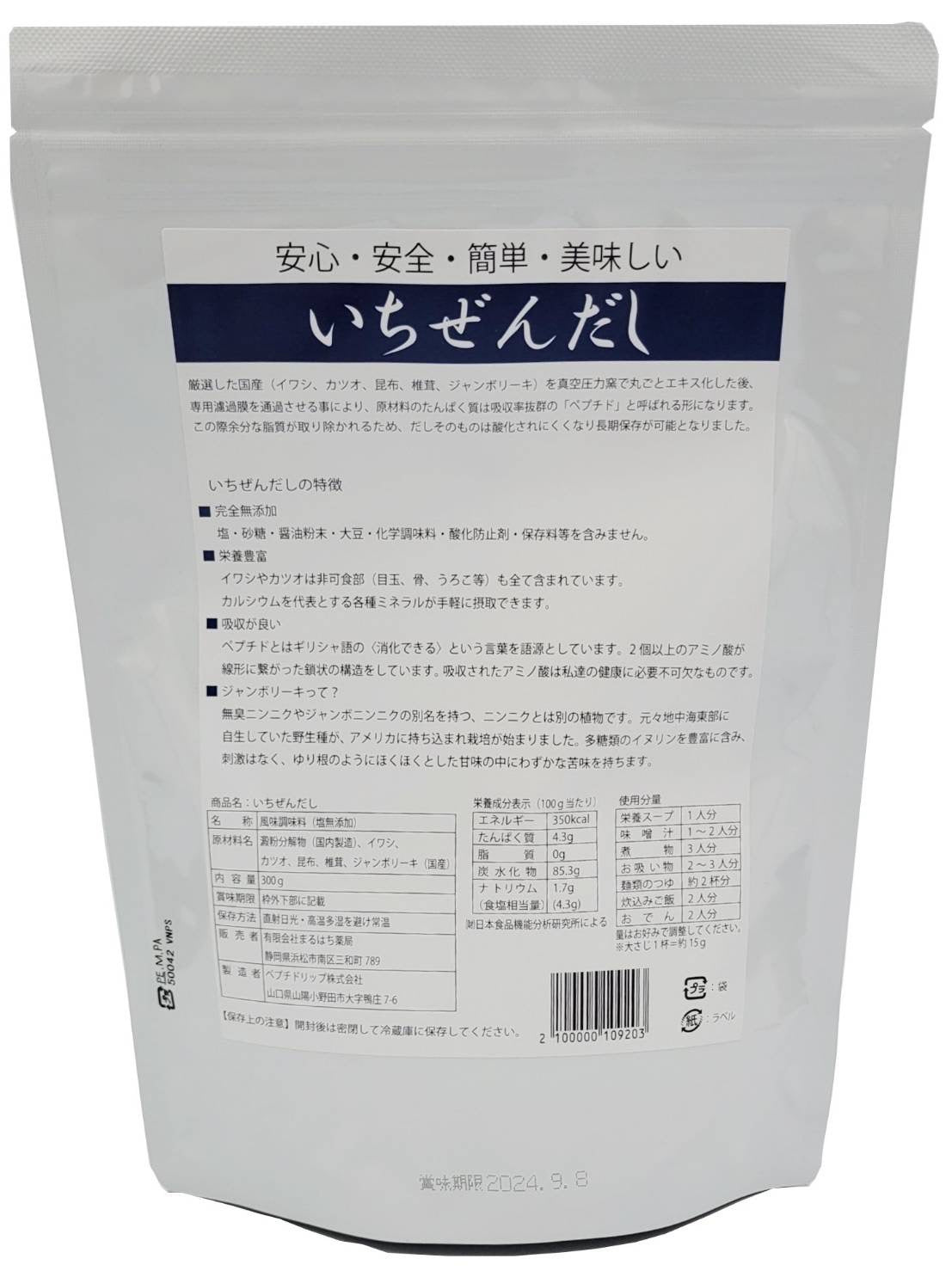 【原材料名】澱粉分解物(国内製造)、風味原料(いわしエキス粉末、かつおエキス粉末、こんぶエキス粉末、しいたけエキス粉末、ジャンボリーキエキス粉末)